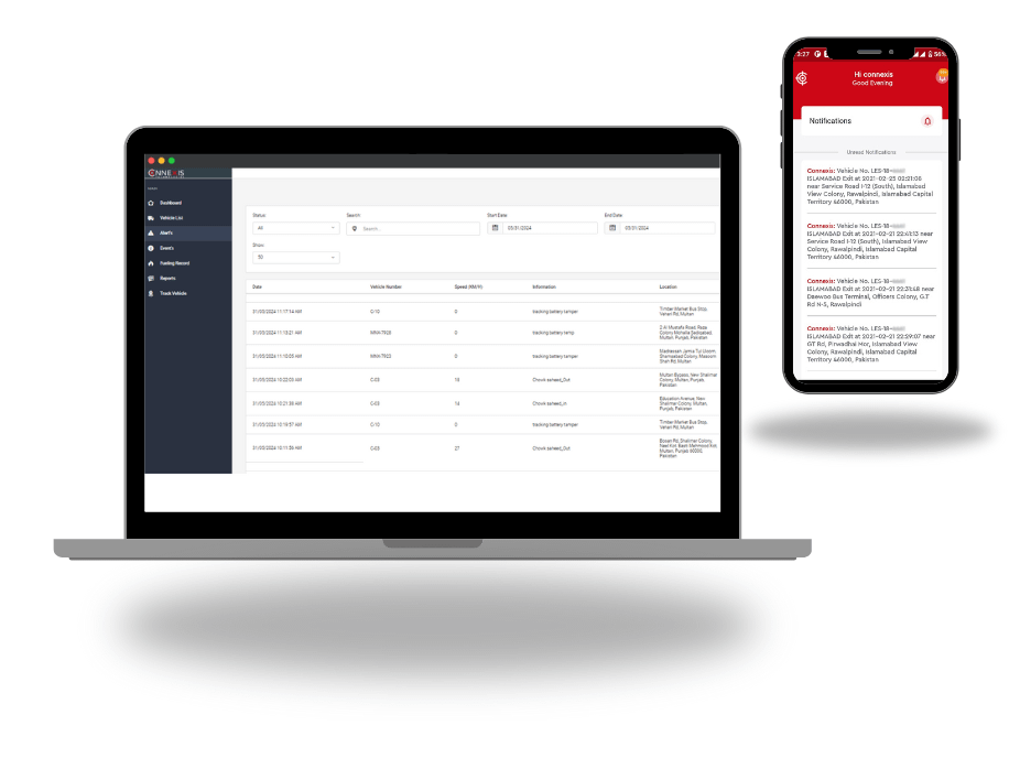 We offers a comprehensive suite of features designed to optimize your vehicle and asset management. With real-time tracking, detailed reporting, cross-device accessibility, fuel and mileage monitoring, and instant alerts and event notifications, Connexis ensures you have complete control and visibility over your operations.